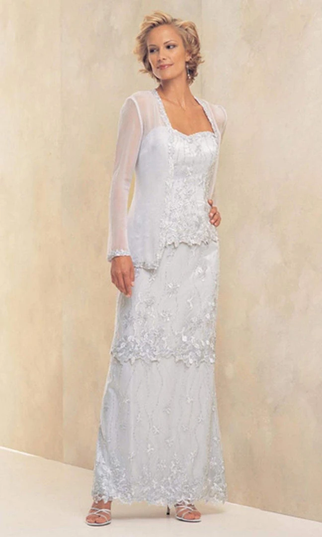 Embrace a classic sense of style in this evening gown by Montage by Mon Cheri 15973. Features a sweetheart neckline, the bodice is covered in appliques while the skirt reveals a slim skirt with matching lace appliques. The look is completed with a matching illusion long sleeve jacket. This Montage by Mon Cheri is perfect for formal gathering or wedding, especially fitting for the mother of the bride.