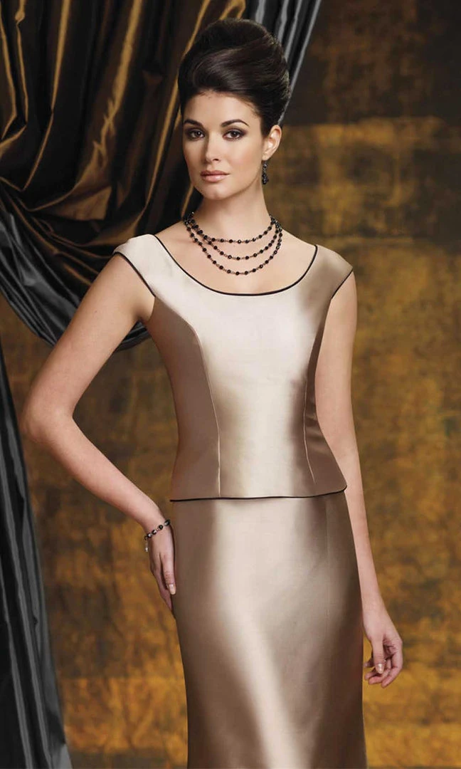 There is no better way to pair sophisticated style with glamour than with this Montage by Mon Cheri 211952 creation. This two piece sheath dress made of Silk Wool Shantung presents a scoop neck with cap sleeves, matched with a jacket accented with lace applique features and three quarter sleeves and shawl collar. Beam with pride with this Montage by Mon Cheri creation. Model is wearing the Taupe/Black color.