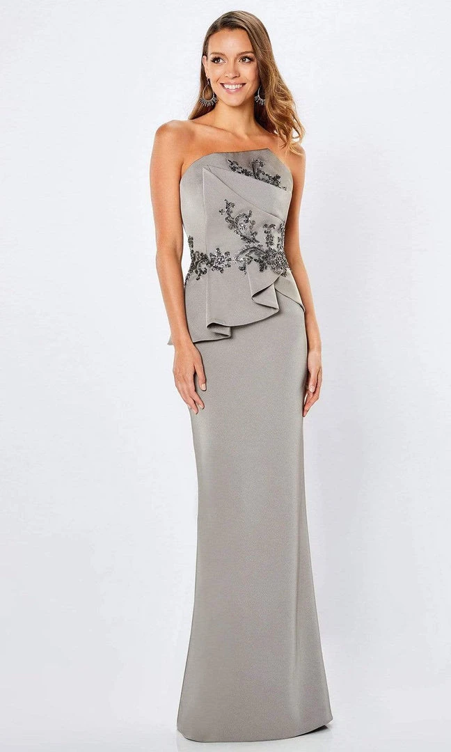 You are sure to be the life of the party when you are wearing this dazzling Montage by Mon Cheri 221974 evening dress. The fitted dress showcases a beaded and embellished bodice supported by a strapless neckline and a pleated peplum design. This also displays a mid-open back with back zipper closure in a column silhouette gracing down to its full length. Have that fabulous look on your next event in this Montage by Mon Cheri masterpiece. Model is wearing Navy and Taupe color.