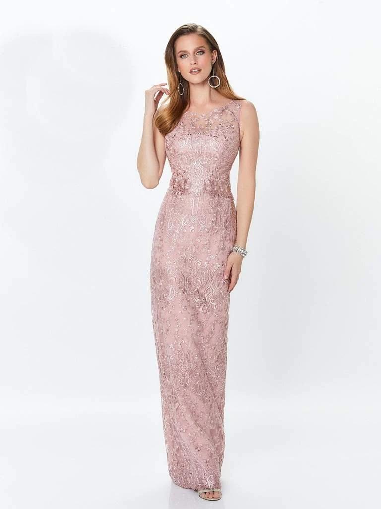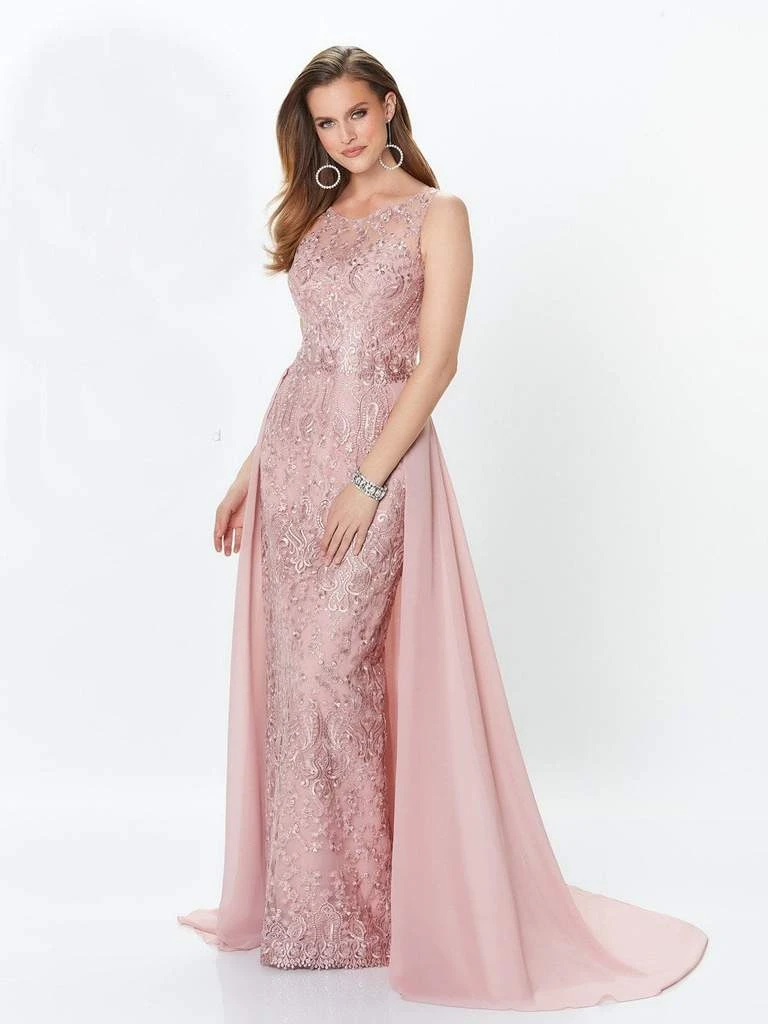 This regal two-piece set brandishes in an embroidered lace embellished special occasion dress. The top features a sheer scoop neckline trimmed with beading, a soft sweetheart bodice with a natural waist, a lace illusion back with a keyhole. The sheath skirt features a back center slit for an ease movement. A detachable chiffon sweep train fastens at the natural waist for a seamless, imperial look. Separate three-quarter embroidered lace illusion sleeves and a matching chiffon shawl with beaded trim are included for even more versatile look.