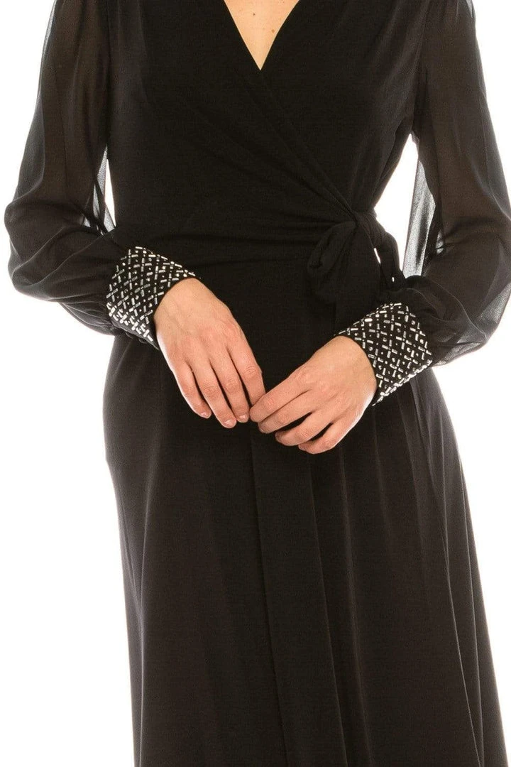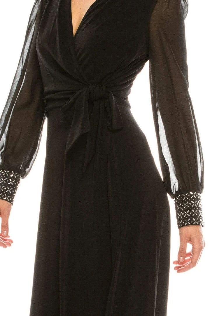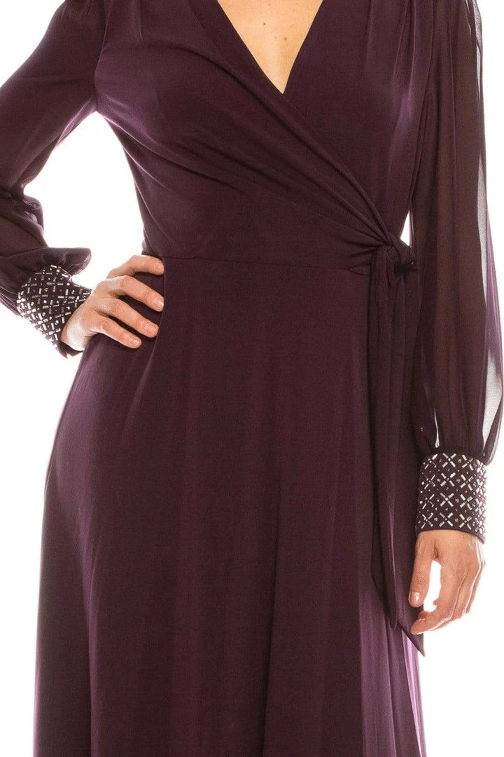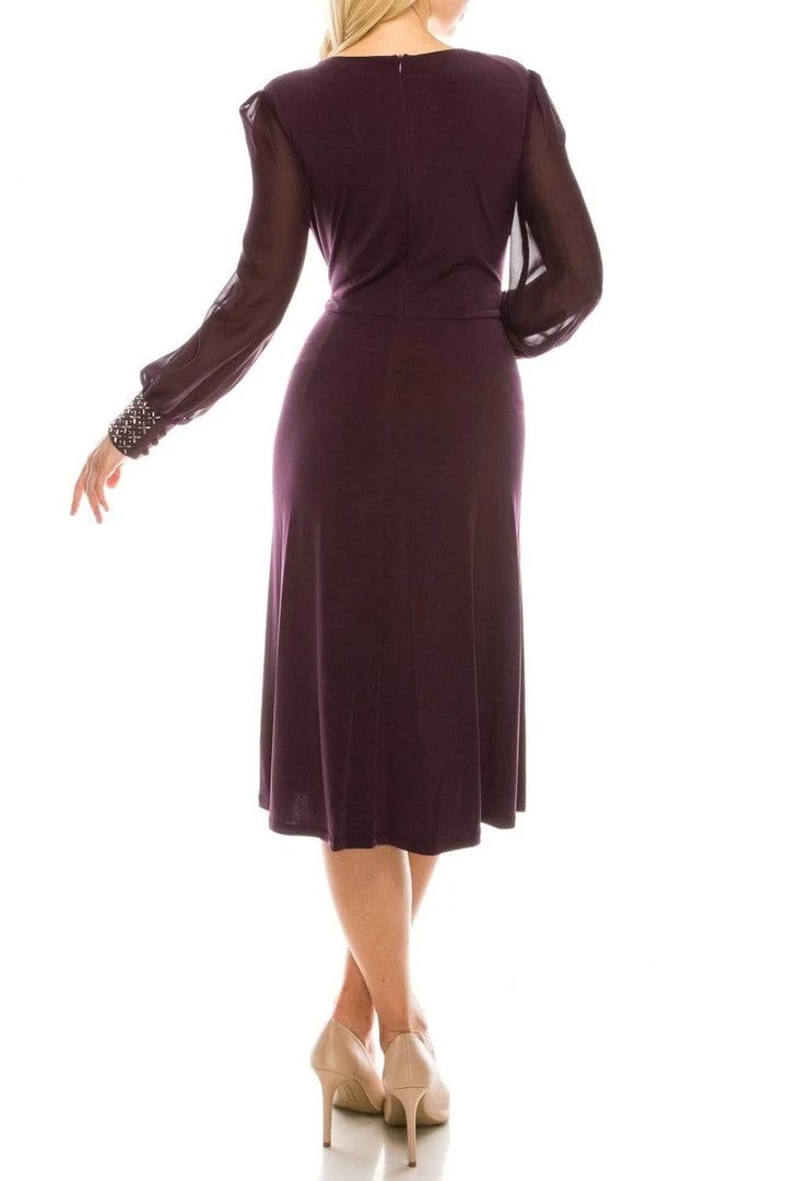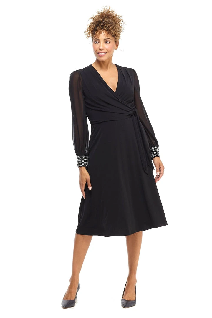 Look sophisticated in this beautiful London Times T4547M cocktail dress. This gorgeous jersey faux wrap dress showcases a surplice V neckline with a tie at the waist and long chiffon puff sleeves with beaded cuffs. The skirt displays an a-line silhouette which graces to the knee length hemline as the full back is secured with a center zipper closure. Capture the glamour in this London Times ensemble.