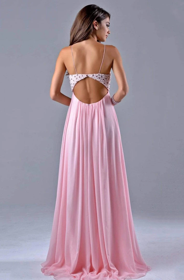 Spaghetti strap, pearl and rhinestone embellished sweetheart bodice. Flowing long chiffon skirt.