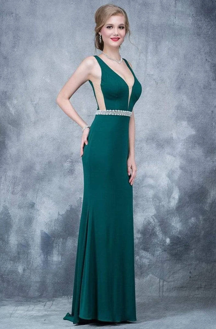 Celebrate your newly found goddess-inspired look when you slip on this stunning Nina Canacci 2124 creation. Fashioned with seams for that appealing figure-flattering shape, this stunner flaunts a sleeveless bodice topped with a plunging v-neckline and an illusion modesty inset. Sheer panels are festooned at both sides of the bodice as an alluringly low v-cut style graces the back. Crowned with shimmering jewels that embraces the waist in opulence, the sheath skirt skims unerringly down to a lush full-length hem and a sweep of train. Be a beauty from all angles as you exude charm in this Nina Canacci masterpiece.