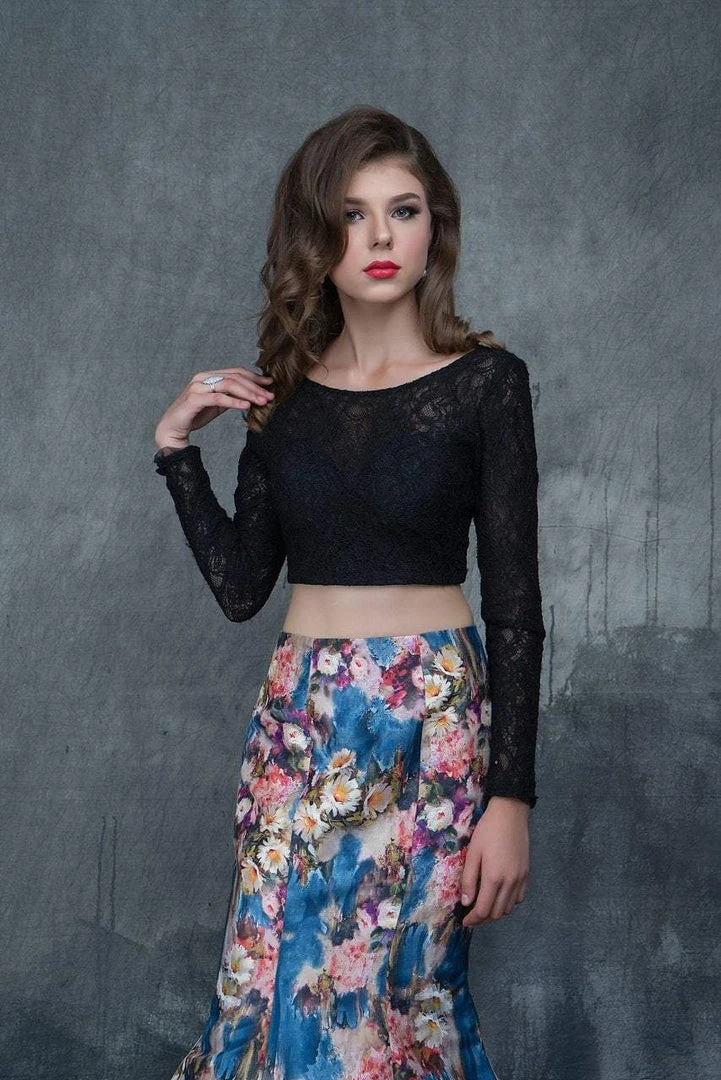 Dress to impress on your next formal event in this simple but captivating two-piece set gown from Nina Canacci 2173. Lace crop top bodice features a bateau neckline with full length sleeves. Floral print formed the full length mermaid skirt. This remarkable Nina Canacci creation is awesome for prom or for any special night event!