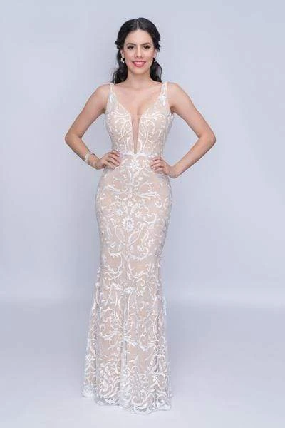 Channel that femme fatale in you when you swirl the night away in this Nina Canacci 2227 creation. Intricately adorned with a showcase of swirling motif overlaying a nude lining, this impeccable piece shows a plunging sweetheart neckline with tapering straps and an illusion inset. Deeply carved with a plunging v-cut open back, the sheath skirt is beautifully ornate with a queenly design that ends in a scalloped sweep of train. Dive into that spectacular party in a mesmerizing style wearing this Nina Canacci masterpiece.
