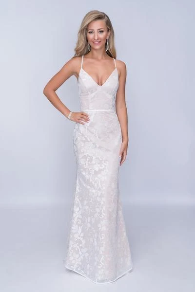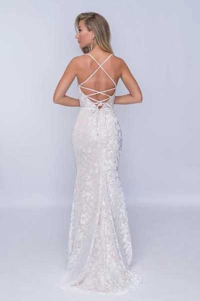 Be the very definition of enticing as you inspire a night of pure glam in this Nina Canacci 2239 creation. Delicately flaunting a beautiful motif of trailing foliage on a rich fabric, this fancy piece flaunts a deep v-neckline supported with spaghetti straps. Alluringly ornate with crisscrossing straps defined with a plunging v-open back, the sheath skirt glides into a lavish floor length hemline with a subtle train. Float into a room and dominate everyone’s attention in this Nina Canacci masterpiece.