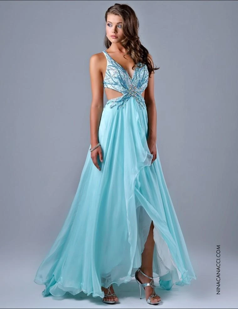 Look daring and sophisticated in Nina Canacci 6018. This gorgeous evening gown features a v-neckline. Cutout sides add a daring appeal, framing the flattering bust. Scintillating beads on the bodice add texture and charm. The layered skirt of ruffled drape cuts around mid waist, that transitions into a slit that reveals just enough of your legs.