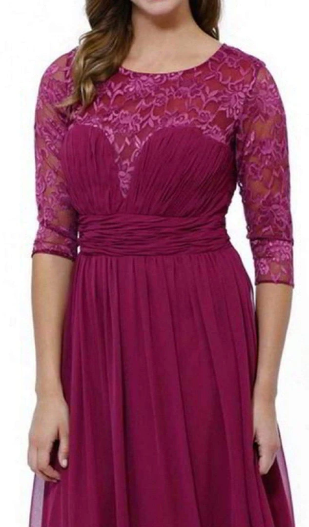 | Details: | Lace, Shirred Bodice, Quarter Sleeves, Pleated Waistband, Semi Sheer Back, Zipper Closure, Full-Length |