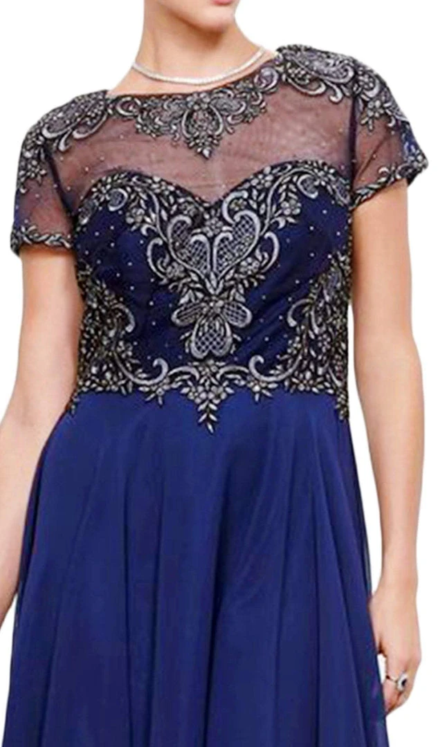 Show off your trendsetting style when you wear this gown by Nox Anabel 5141. A-Line, Full length mother of bride evening gown has gently gathered, solid color chiffon skirt and detail beading embellished and embroidered, semi sheer bodice with jewel neckline, short sleeves and zipper Back. Look good and feel good with this ostentatious extravagant gown from Nox Anabel.