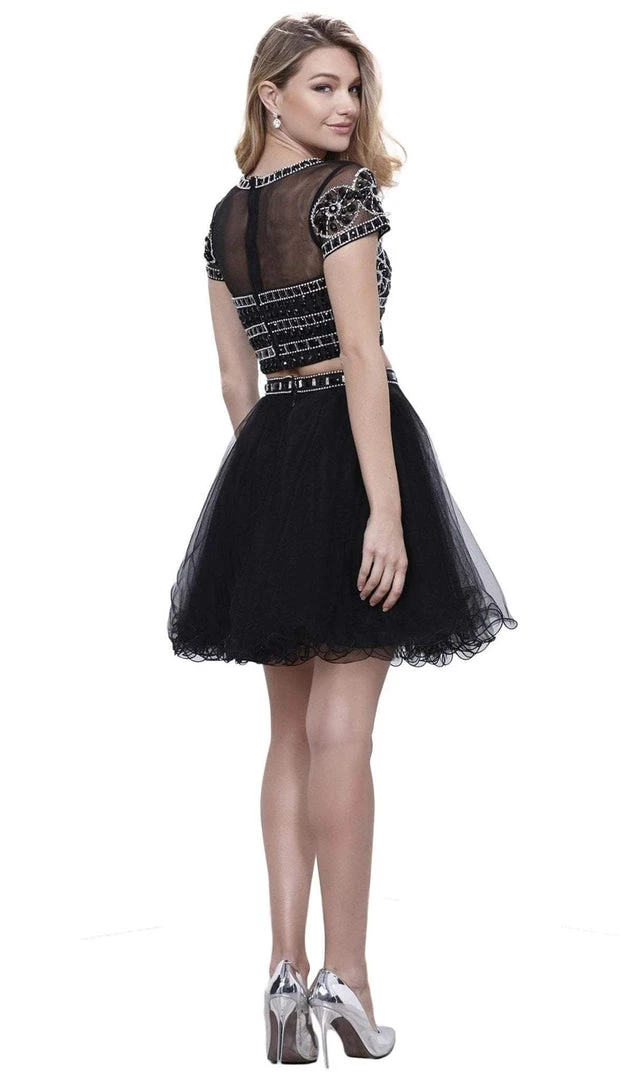 Be the star of your every party with this dramatic jewel embellished Nox Anabel 6229 ensemble. A bateau illusion over a straight neckline and embellished meshed closed back with short sleeves create s bohemian chic appeal to this two-piece outfit. The cropped top is intricately beaded with medallion and strip designs on a sheer fabric. A band of the same rhinestone encrusted design graces the midriff and navigates the eyes to a gush of soft tulle fabric finishing at a mid-thigh hem. Foster fascination and delight in this Nox Anabel tulle masterpiece.