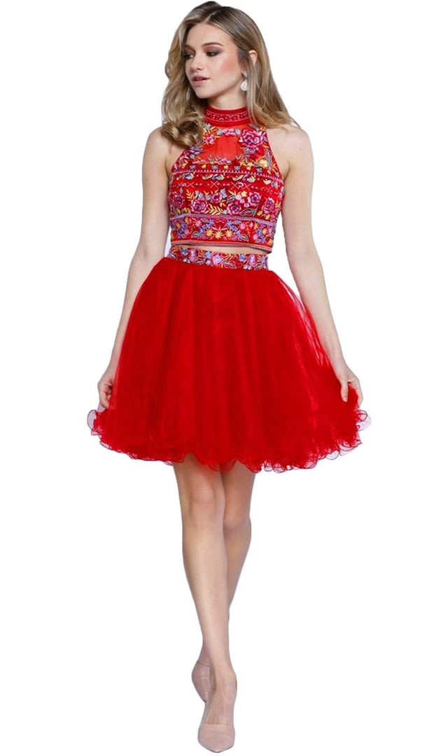 Look stunning in this short two-piece prom dress by Nox Anabel 6272 creation. A halter neck party dress with an illusion cut out above the bustline and fully embroidered multi-colored floral designed bodice and waistband. Features an open midriff and a graceful A-line silhouette of multi-layered tulle skirt. This charmingly romantic short dress is sure to flatters any figure. Go and have fun celebrating your next special occasion in this fun and flirty Nox Anabel masterpiece.