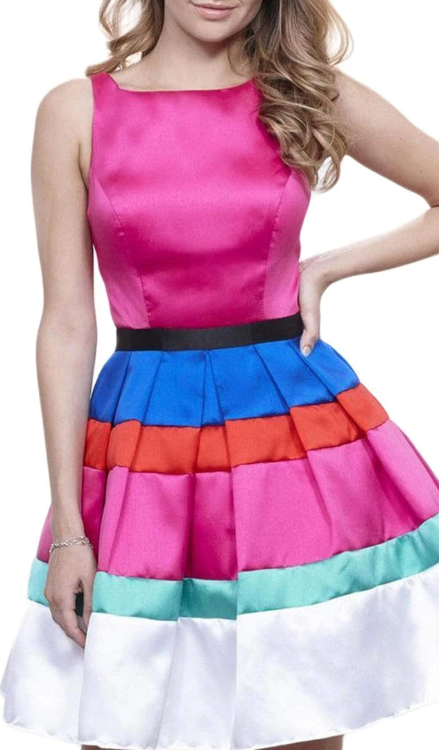 | Details: | Bateau Neckline, Strapped Cutout Open Back, Sleeveless, Ribbon Waistband, Princess Seams on Bodice, Color-Blocked Pleated Short Skirt, Mikado Fabric, Back Zipper |