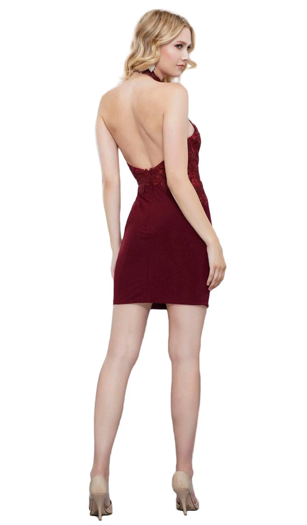 Look utterly sultry at your event in this fabulously sculpted Nox Anabel 6309 creation. Lavishly embellished with elaborate lace appliques topped with beadwork, this stunner shows a high halter neckline accented with angular cut-in shoulders and a sexy illusion bodice. Crafted with a ravishing low open back, this ensemble also unveils scalloped lace details streaming just below the natural waist. The sheath skirt contours divinely down to a short hemline. Make a debut as a trendsetter to watch for in this captivating Nox Anabel masterpiece.