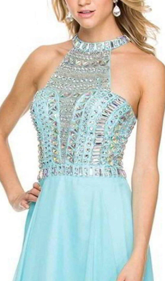 Sizzle and shine with this dress by Nox Anabel 8157. An elegant A-line dress designed with a halter neckline and with stunning embellished details on that beautifies this creation. This Nox Anabel creation is perfect for women looking for that stunning form-fitting style.