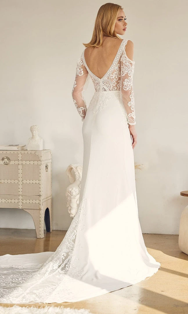 | Details: | Long Sleeve, Cold Shoulder, Wide Straps, Illusion Bodice, Sheer Inset, Embroidery, V-Back, Back Zipper, Court Train |