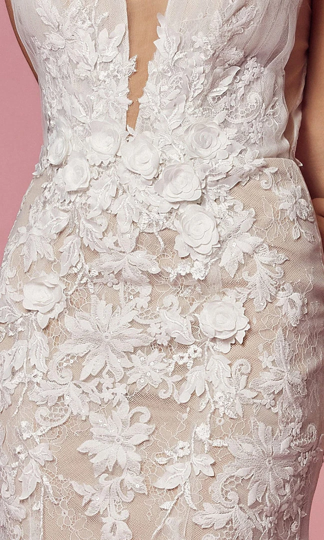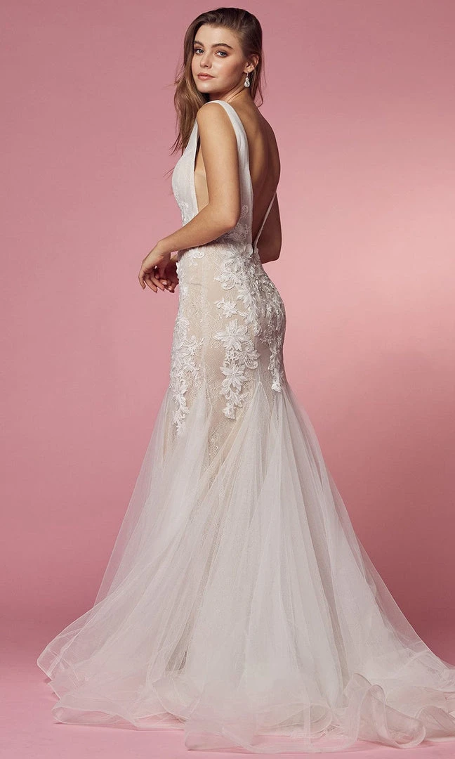 Strike a pose as you enter the room in this exquisite Nox Anabel Bridal JE917 gown. Crafted in 3D floral appliques and lace embroidery, this ensemble features a plunging V neckline and V-back with a sheer inset panel at the bust and side. A center zipper closure secured the back while the mermaid skirt sculpts and flares into a court train and has a horsehair hemline. This Nox Anabel Bridal creation will sure to display your natural beauty and grace. This stunning collection of Nox Anabel dresses will reflect your personality and give you an elegant red-carpet look. Model is wearing the White/Nude color.