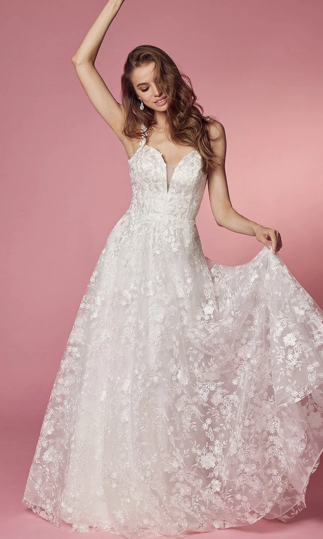 Turn yourself into a head-turning beauty by slipping into this absolutely eye-catching Nox Anabel Bridal JE922 design. This sleeveless gown is designed with floral embroidery throughout its length. It features a plunging sweetheart neckline and open back supported by wide straps. The back is accented with buttons and has a zipper closure. The skirt forms a full length A-line silhouette and finishes in a sweep train. This Nox Anabel Bridal creation is truly remarkable! This stunning collection of Nox Anabel dresses will reflect your personality and give you an elegant red-carpet look. Model is wearing White color.