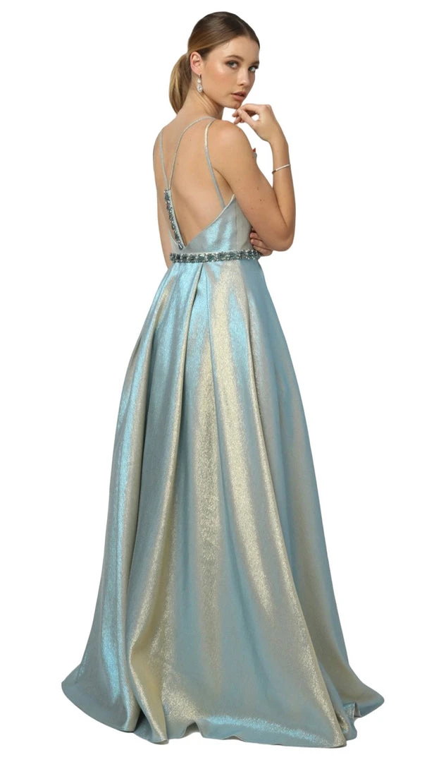 | Details: | Glitter Fabric, Sleeveless, Illusion Inset, Spaghetti Straps, Bejeweled Waistband, Beaded Strappy Back, Low Open Back, Back Zipper Closure, Full Length Hem |