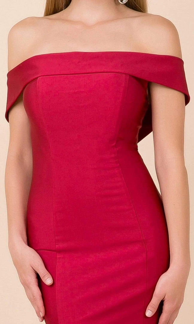 Flaunt your best assets in this figure-flattering evening dress by Nox Anabel N295. An off-shoulder neckline with folded detail crowns the fitted bodice, complemented with a mid-open back. Contoured with princess seams, this dress hugs your fabulous curves up to the hips as the skirt flares elegantly to the floor, highlighting a trumpet silhouette. This dress is completed with a sweep train for a dramatic effect. Beam with pride when you wear this stunning Nox Anabel creation. Model is wearing Dark Red color.
