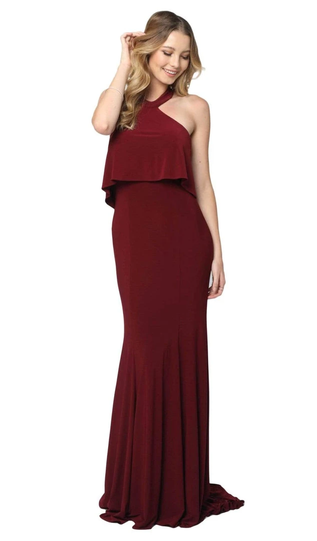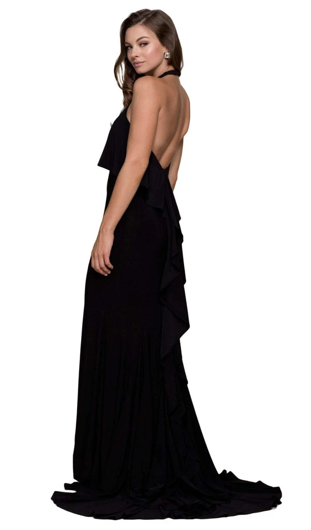 Get a timeless and trendy look in a new dress from Nox Anabel Q132. Glams in a sleeveless, halter neckline with a wave overlay at the front. The dress flaunts an open back detail and accents the trumpet skirt with a ruffle detail. Bringing drama to the look is a sweep train finish. Claim that look of sophistication wearing this glamorous look by Nox Anabel.