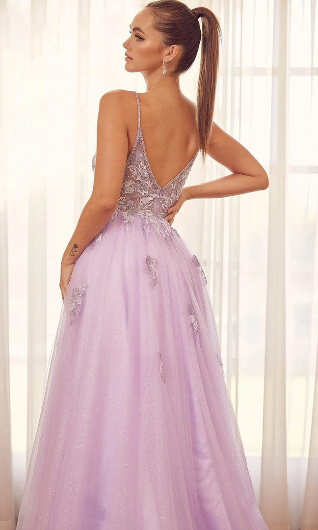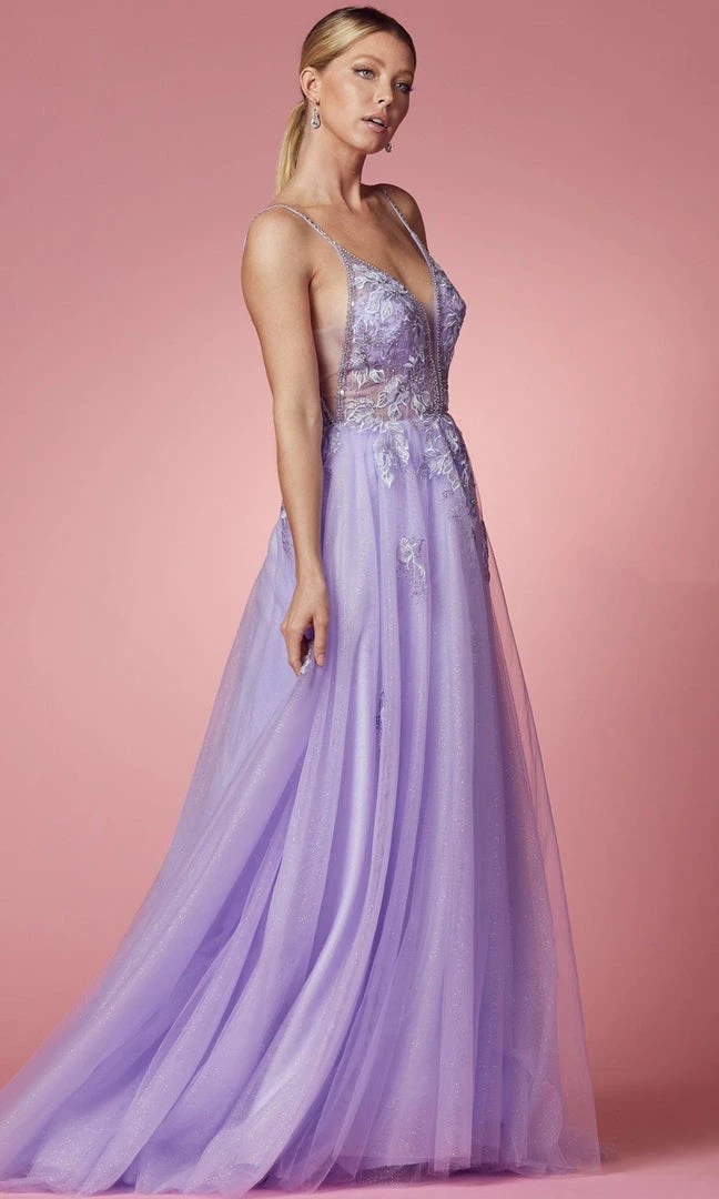 Be the loveliest of them all wearing Nox Anabel T1012 creation. Detailed with floral lace appliques and beadwork, this gown boasts a plunging V neckline and low V-back trimmed with gleaming beads. This also highlights a sheer inset detail at the bust and sides. The glitter A-line skirt features a gathered detail as it cascades down to a full-length hem with a sweep train. Be the ultimate belle of the party in this gorgeous gown from Nox Anabel. This stunning collection of Nox Anabel dresses will reflect your personality and give you an elegant red-carpet look. Model is wearing Lilac color.