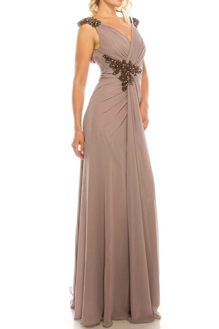Make a spectacular appearance at your opulent party in this Odrella 1301 creation. Draped into a surplice that is textured with gathered pleats, this gown reveals a deep v-neckline and a pair of beaded cap sleeves. Accented with a ruche-ornate v-open back, lovely drapes commence to stream from an appliqued waist down to a graceful train. Grab everyone???s attention in this impeccable Odrella masterpiece.