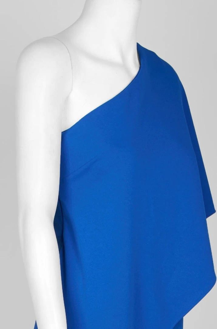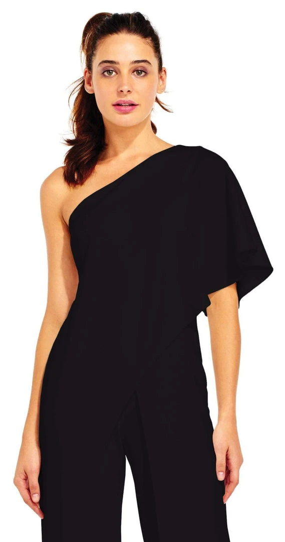 | Details: | Crepe fabric, One shoulder short sleeve, Cape, Overlay, Wide leg pants, Side zipper closure, Lining is 100% Polyester |