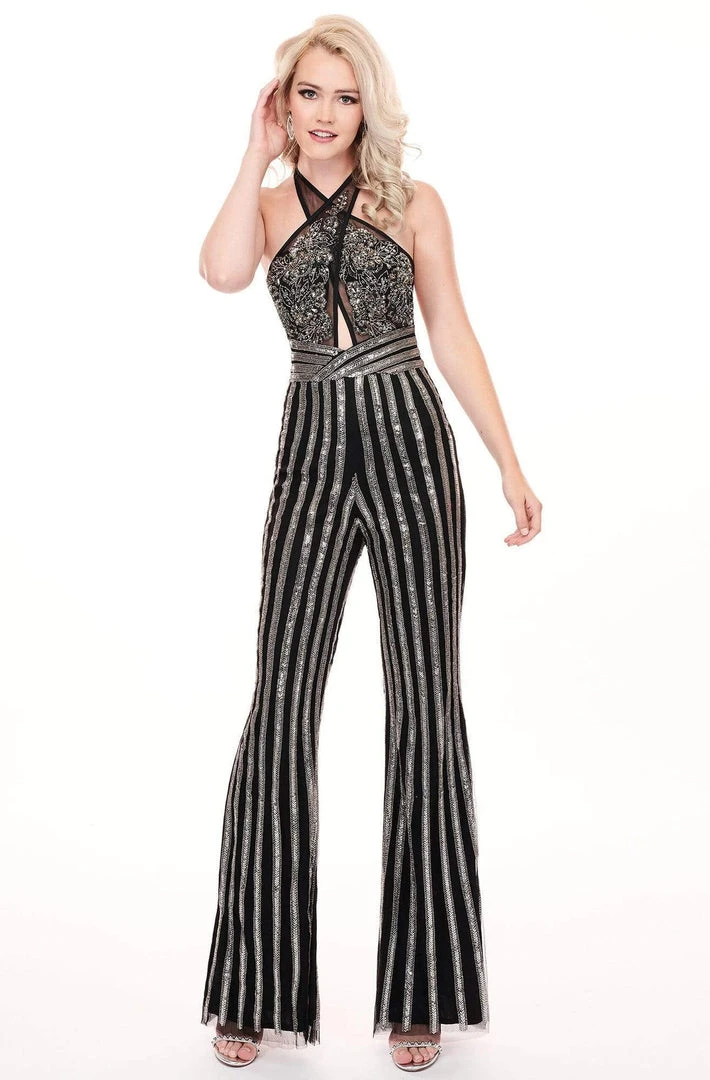 Razzle dazzle the entire party in this crystal beaded jumpsuit by Rachel Allan 6415. Features a criss cross halter neckline and flared full length pant. This fully beaded jersey suit has an open back to give your best over the shoulder smile. Waltz into the party looking fabulous in this Rachel Allan look.