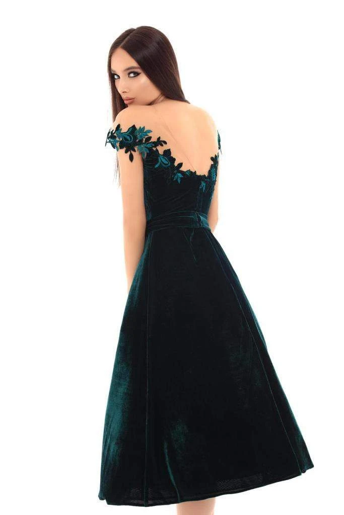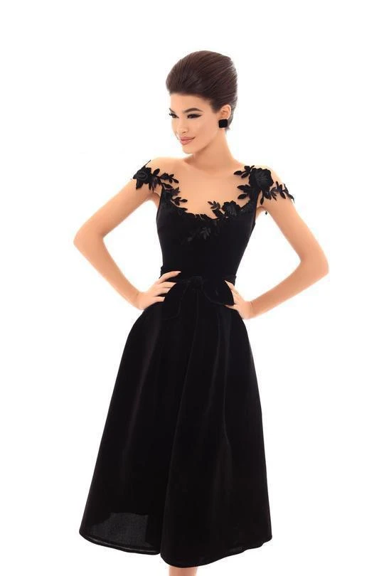 Dazzle everyones this dress by Tarik Ediz 93668. This illusion neckline dress glams with cap sleeves detailed with floral embroidery. The velvet dress is cinched with a tie waist and is styled with a V-back and a zipper closure. The skirt has a flowy A-line silhouette that runs at knee length hem. Look and feel like the belle of the party when you slip into this stunning Tarik Ediz look.