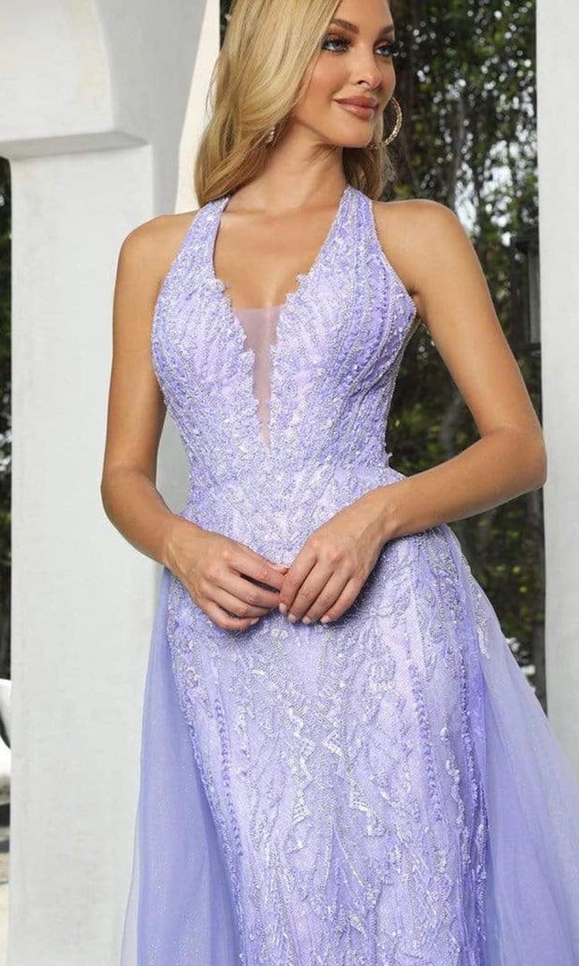 Be beautiful in this fashionable evening Portia and Scarlett PS22926. You will be the most beautiful among them all when you wear this gown embellished with beads and sequins. Presents in a halter V neckline with plunging style and an attached sheer panel. A tulle overskirt is added for extra volume and drama. Breeze through your special day while making a stylish statement in this Portia and Scarlett masterpiece.