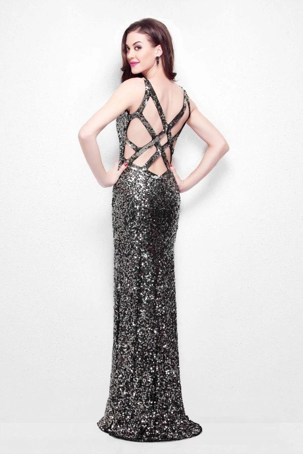 Capture that striking presence and captivate the crowd in this shimmering and sophisticated Primavera Couture 1159 masterpiece. This long gown is sleeveless and highlights a v neckline. Sequins all over are stunningly embellished at the fitted silhouette. The back is highlighted by the cutouts produced by the sexy straps and flows to a full length hem ending to a mini train. Spice up your date in this lavishly designed Primavera Couture creation.
