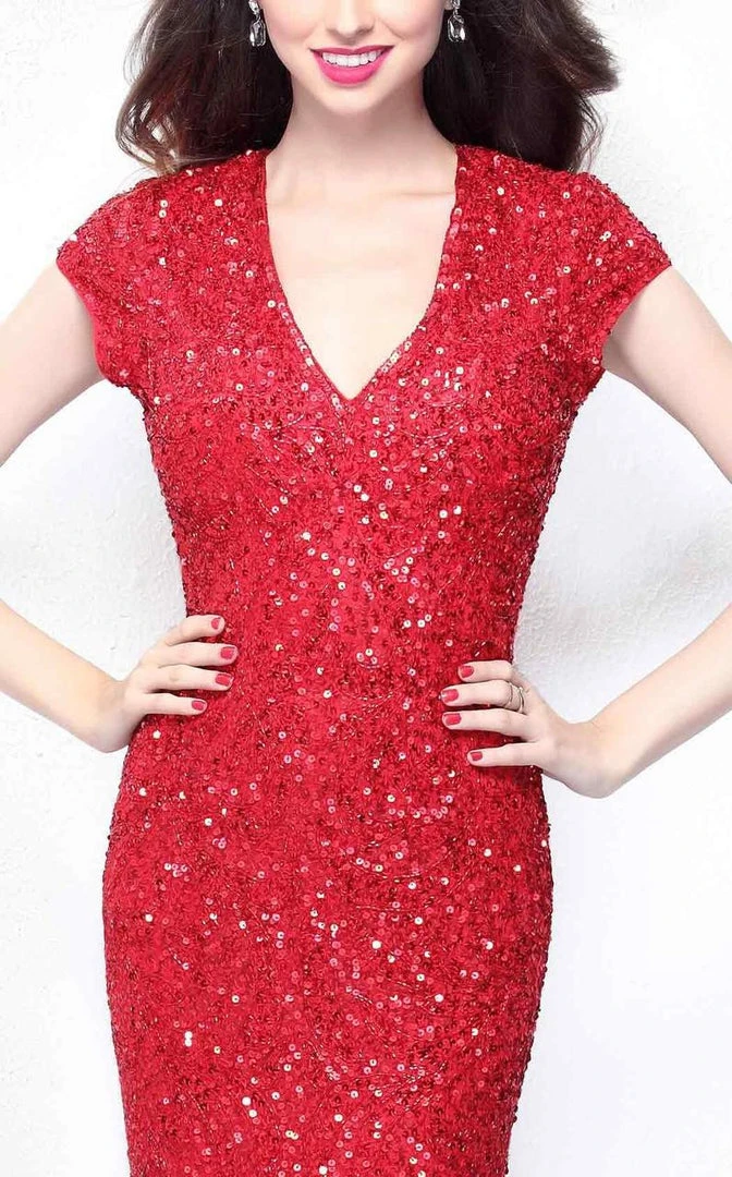 Elegant and alluring, this sophisticated long gown from Primavera Couture 1413is ready to shine at any event. This stunningly embellished long gown features a v neckline and cap sleeves. Sequins are sparkled allover that is ready to flatter from any angle. The back of the gown is spectacular with a partially open back shaped in a lovely circle. This full sheath ensemble flows to a full length hem ending to a mini train at the back. A center zipper closure encloses the back for a flawless fit.