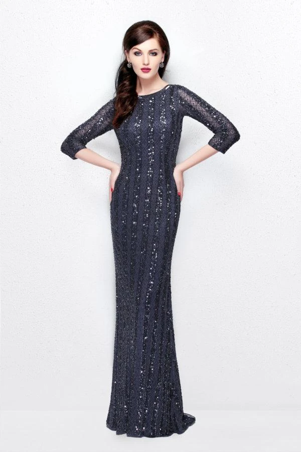 This dress has quarter length sleeves and fine glittering embellishment throughout. The dress is fitted. The skirt has a slender flared shape with a decadent train at back.