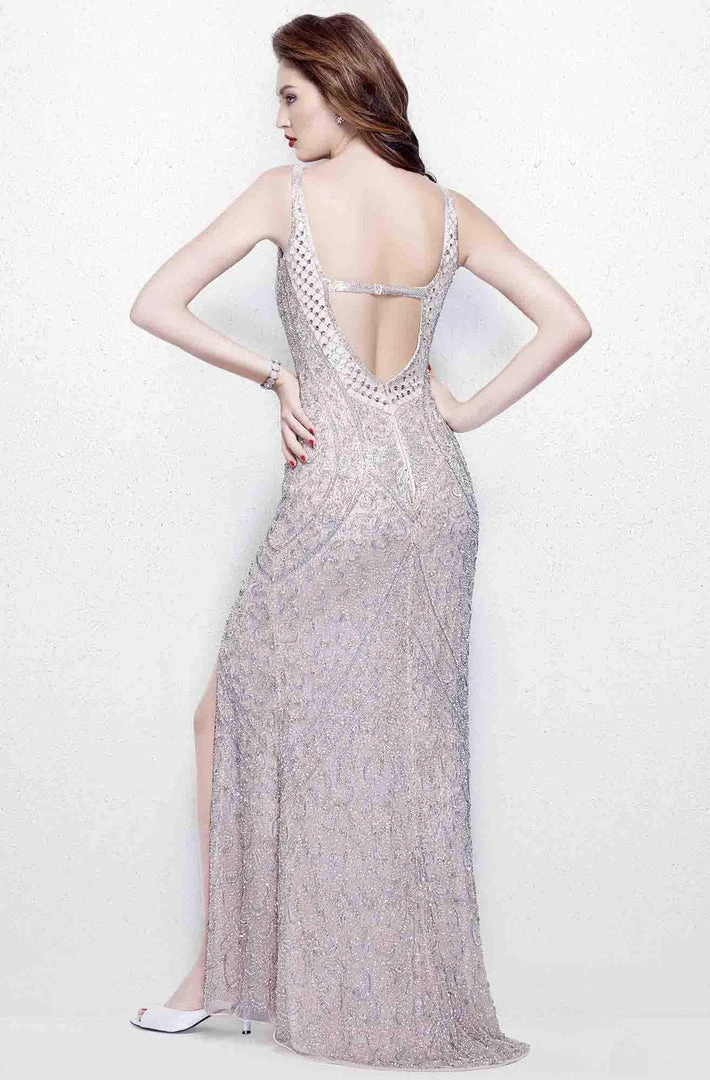 Be brazen and bold in a vivid gown from Primavera Couture 3040. This strappy look delves into a scintillating sweetheart shape about your bust and strappy cutout. The shimmering embellished pattern flourishes down the full length with a high slit and a sweep train. Stay dazzling in this gown with a twist from Primavera Couture masterpiece.