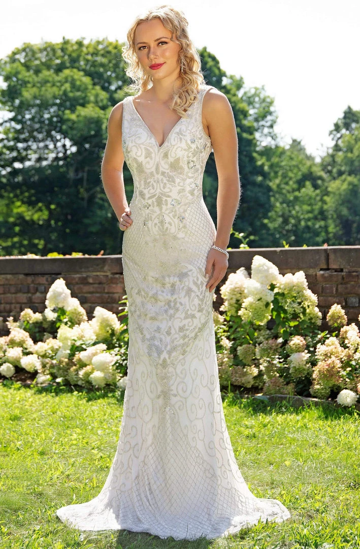 Walk in seduction and style in Primavera Couture 3232. Fashions a sleeveless, plunging V-neckline with fitted bodice adorned with glittering embellishments. The back flaunts a low scoop cut and the skirt flourishes a full length sheath skirt with a sweep train finish. Capture that striking presence and get everyones attention in Primavera Couture.