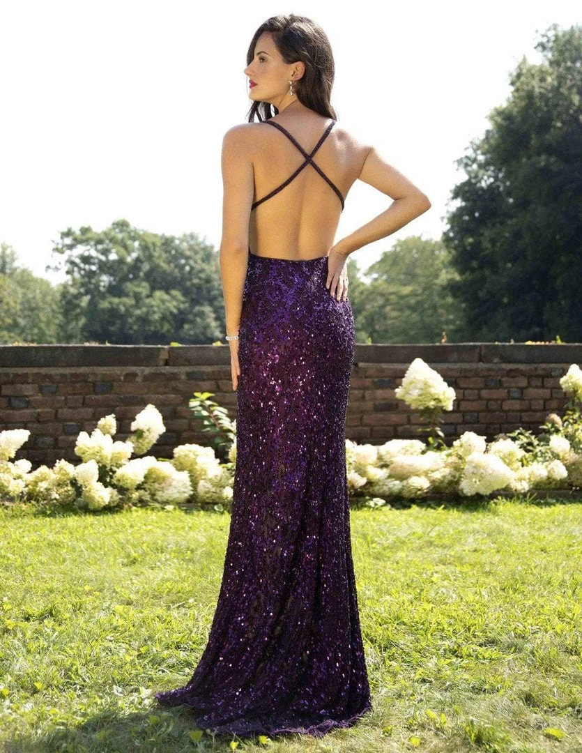 Flourish a style that will make you stand out in this Primavera Couture 3295 creation. Fundamentally embellished with sequins on its entirety while showing scroll motif beadwork, this delight flaunts a deep v-neckline supported with spaghetti straps. Fashionably defined with a backless design and crisscross strapped accents, the sheath skirt shows a gentle flare that parts with a high leg slit and completes with a train. Set the tone of this festive night while donning this Primavera Couture masterpiece.