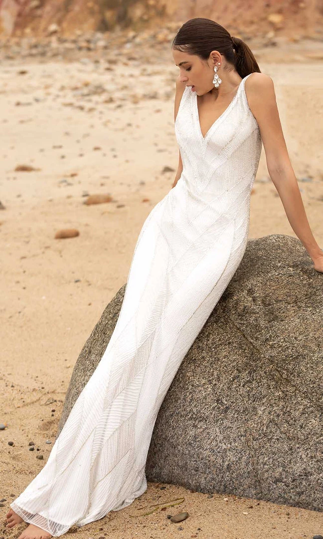 | Details: | Embellishments, Sleeveless, Plunging neckline, Fitted bodice, Sheath skirt, Low back, Back zipper, Sweep train |
