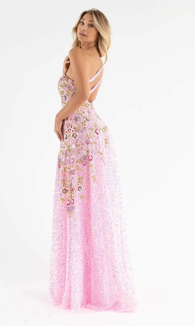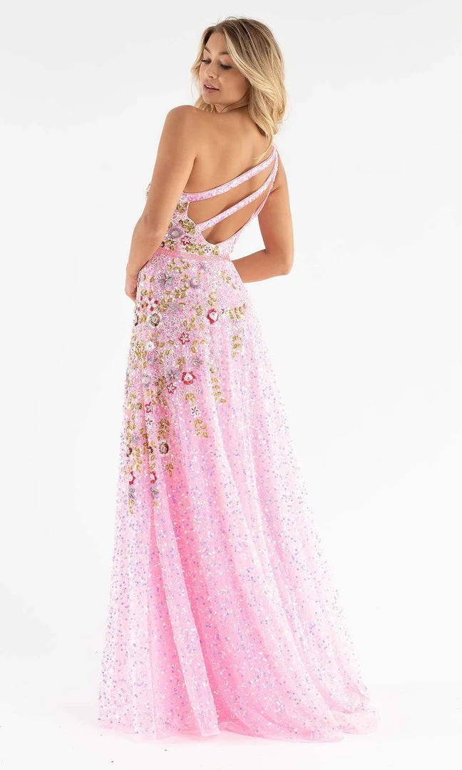 Be one of the best dressed lists as you show up in this Primavera Couture 3736 masterpiece. Designed in fully beaded and floral patterned sequins, this ensemble showcases fitted bodice with an asymmetrical neckline and singe shoulder strap. The waist is accented with a beaded waistband giving way to the embellished tulle A-line skirt. The open back displays strappy back and a sweep train for added drama. Walk in a defined sophistication and beauty wearing this Primavera Couture creation. Model is wearing Black Multi color. Primavera Couture’s sparkling long sequin dresses and cocktail dresses will dazzle you with compliments as these dresses are extremely impressive.