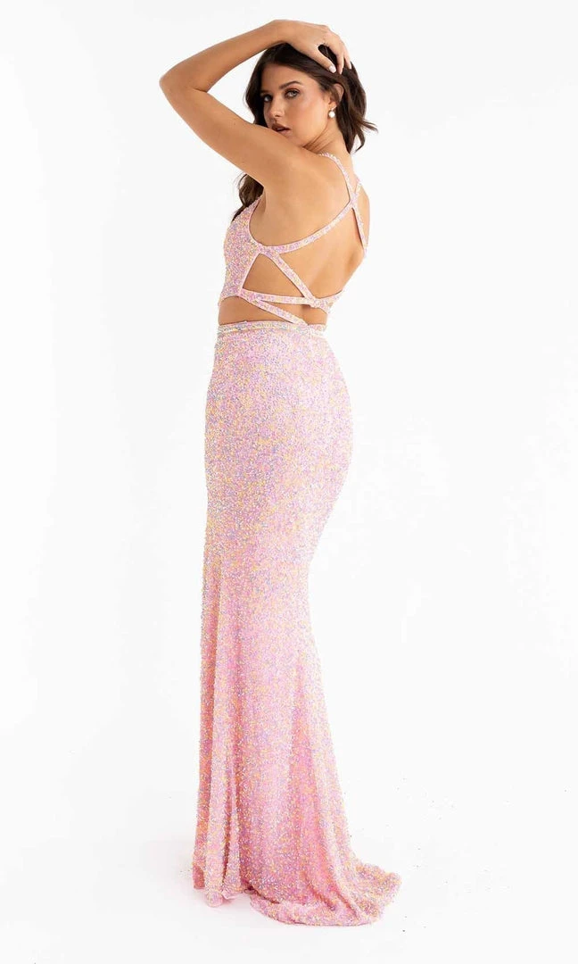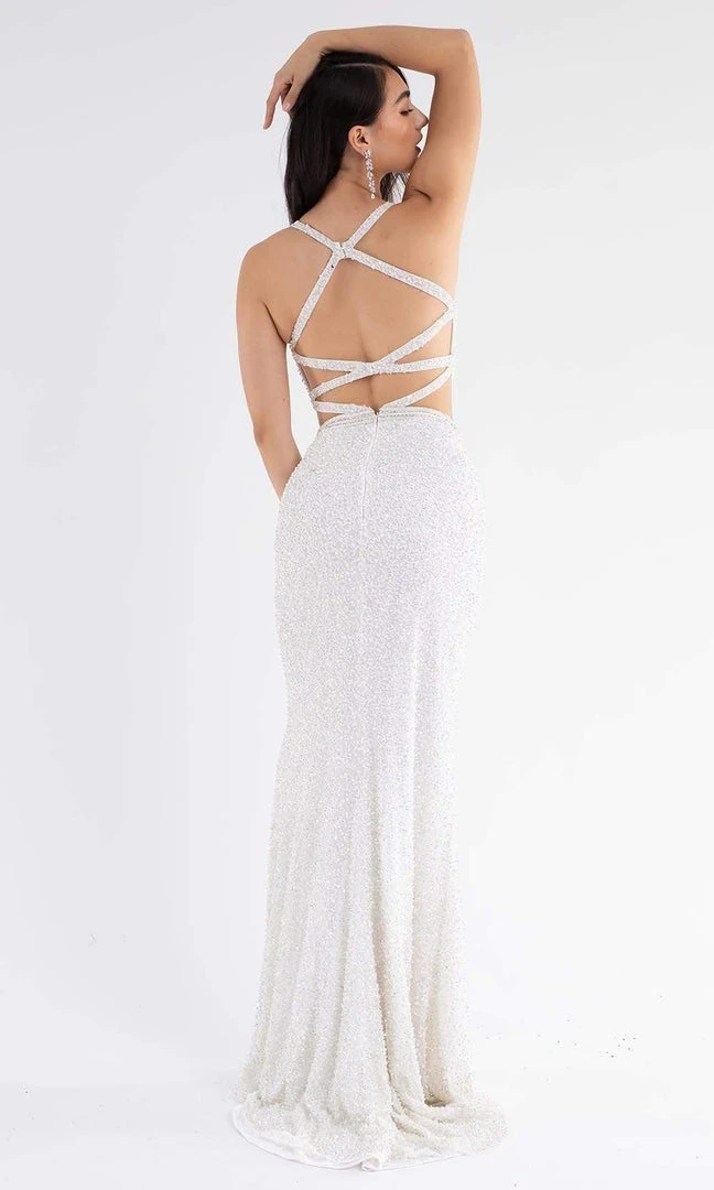 Promote attention-grabbing style in this stunning Primavera Couture 3744. A plunging V-neckline offers you a sexy touch to this sequins all the way to the floor length skirt. This made more sexier with the cutouts at the waistline and the multiple crossing wide straps in the back and with the high slit. Primavera Couture for a flattering look. Primavera Couture’s sparkling long sequin dresses and cocktail dresses will dazzle you with compliments as these dresses are extremely impressive.