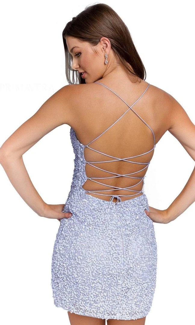 Orchestrate a spectacular evening of dazzling sophistication in this luxurious Primavera Couture 3891 masterpiece. This jaw-dropping design showcases a faux-wrap fitted bodice completely embellished in sparkling sequins. The sleeveless dress features a deep V-neckline and spaghetti straps leading to the sexy bareback that creates an adjustable lace-up tie. Flaunting a side slit for ease of movement, the skirt is sculpted in a sheath silhouette that tapers in a mid-thigh hem. Get noticed in this radiant cocktail dress from Primavera Couture. Models are wearing the Baby Pink, Blue, Black, Bright Blue, Emerald, Fushia, Gold, Ivory, Midnight, Neon Coral, Neon Lilac, Neon Pink, Neon Sage, Orange, Purple, Red, Turquoise and Yellow colors.