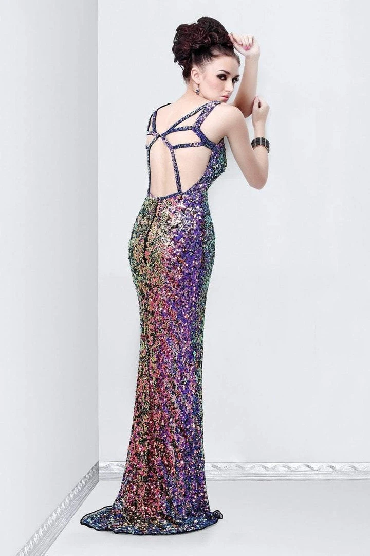 Sparkle and shine in this ravishing Primavera Couture 9500 evening gown. The vivacious V neckline pulls up into slender shoulder straps that pull down to the cut out back design. Shimmering sequin embellishments are perfectly placed all over this curve-conforming silhouette. The fitted bodice shines down to the long floor length skirt and mid-thigh slit. Make your forever lasting impression in this Primavera Couture creation.