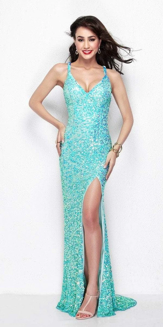 Mesmerize everyone in this glittering dress by Primavera Couture 9987. A sleeveless body hugging dress entirely embedded in sequins. A distinctive deep V-neckline and slinky strap flows over at the back giving a crisscross cut-out pattern. Look sophisticated and mature in this simple yet chic Primavera Couture.