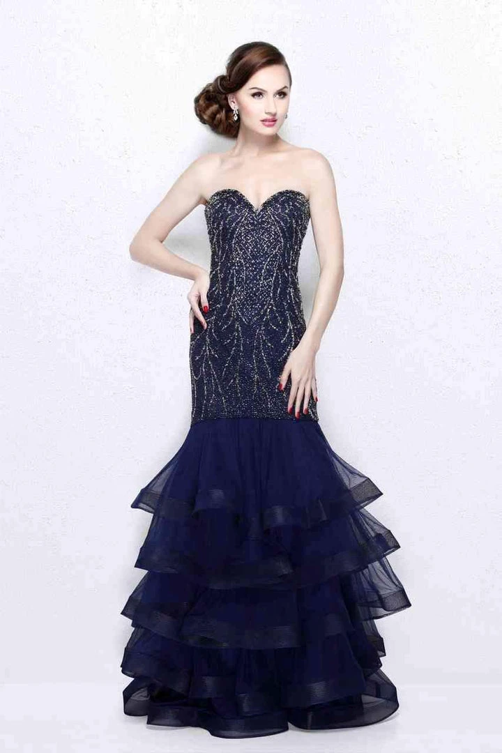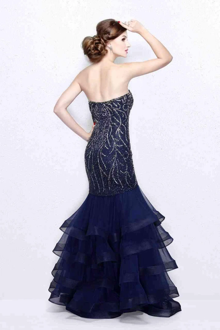 Captivate attention as you capture hearts in this glamorous Primavera Couture 1854 creation. Flaunting a splendidly ornate silhouette, this stunner features a strapless, sweetheart neckline with a sultry semi-open back. Sculpting generously from the hips down to the mid-thigh, the lavish tiered mermaid skirt flourishes as it courses down and completes in a full-length horsehair-trimmed hem. Be a timeless beauty in this gorgeous piece by Primavera Couture. Model is wearing the Ivory, Burgundy and Midnight colors.