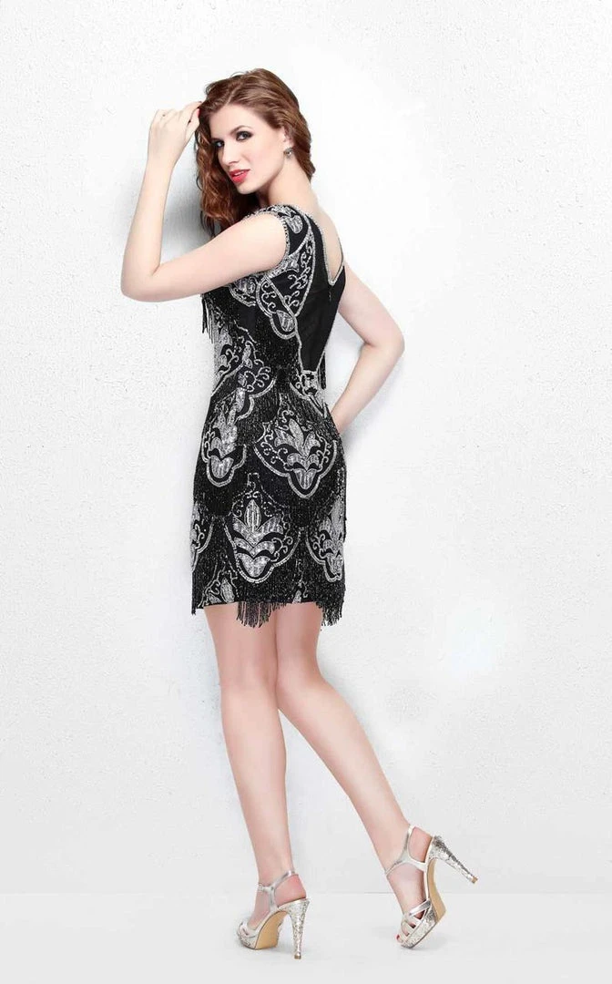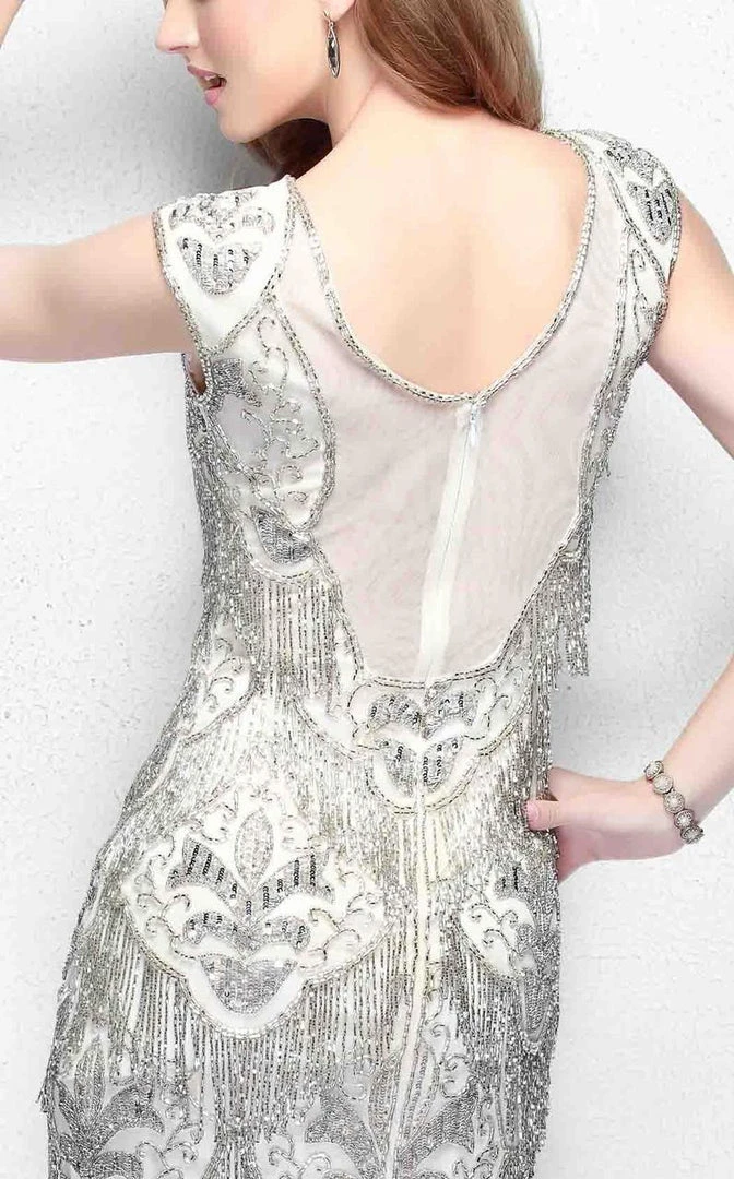 Be the spotlight wearing this stylish Primavera Couture 1658 cocktail dress. This dress has embellished cap sleeves and sheer fabric at the upper portion. A contrast sparkling print works throughout the dress, which gently skims the figure. Fringe accents add texture and the look finishes with a modest hem. Primavera Couture is a perfect choice for a flattering look.