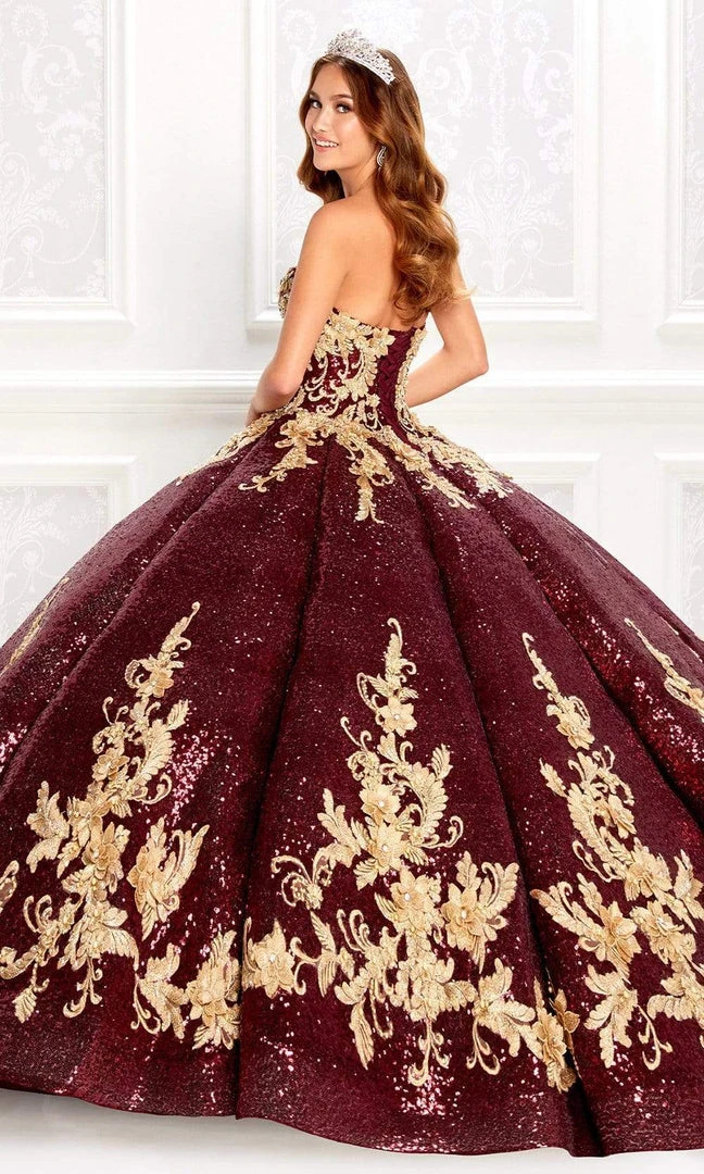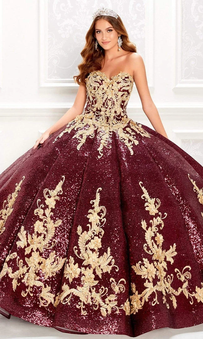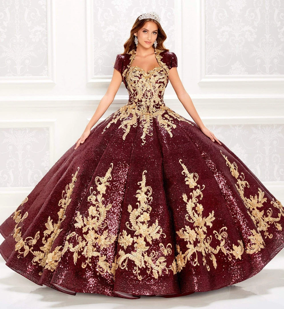 Make your grand entrance in Princesa by Ariana Vara PR22030. This novelty sequin ball gown features a sweetheart neckline, lace appliques and beading on the neckline, basque waist, corset back, horse hair hem designed with stone accents throughout. Matching sequin jacket included. This Princesa by Ariana Vara creation is simply captivating! Model is wearing Wine/Gold color.