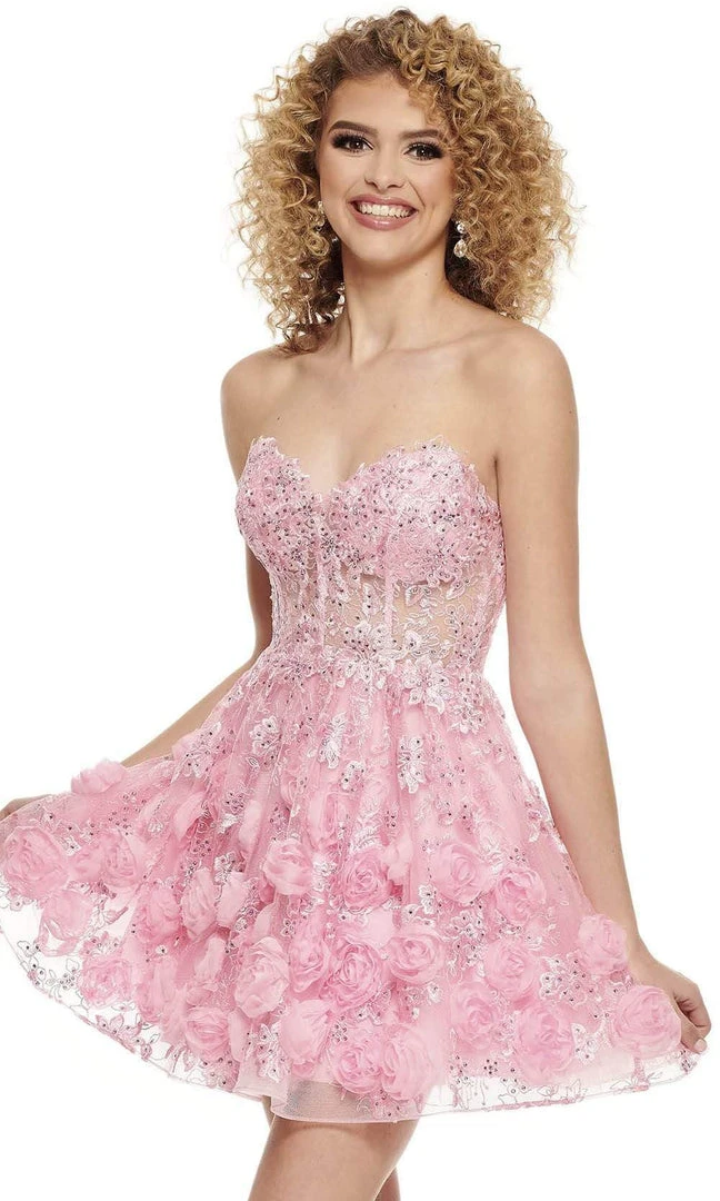 Flaunt your figure in this fabulous Rachel Allan 40090 dress. This short dress showcases a sweetheart neckline in a fitted sleeveless, beaded and appliqued bodice. Having an A-line silhouette, this also displays a mid-open back with lace up back closure. Look amazing for the party in this Rachel Allan creation.