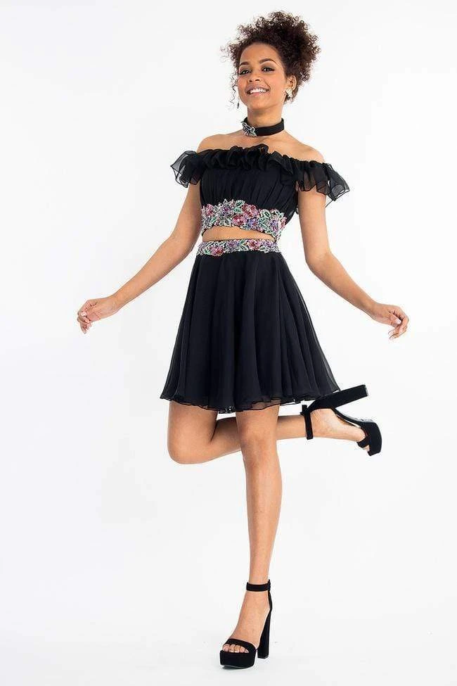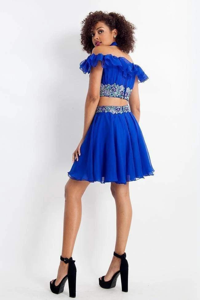 This Rachel Allan 4639 is a Spring favorite that is now made into a short dress! Walk into Homecoming with this two piece set. This chiffon dress charms in a ruffled off-shoulder neckline with crop top and waist adorned with multi-colored beading. The back has a zipper closure while the chiffon skirt opens an A-line silhouette. Step out in style wearing this mesmerizing Rachel Allan dress.