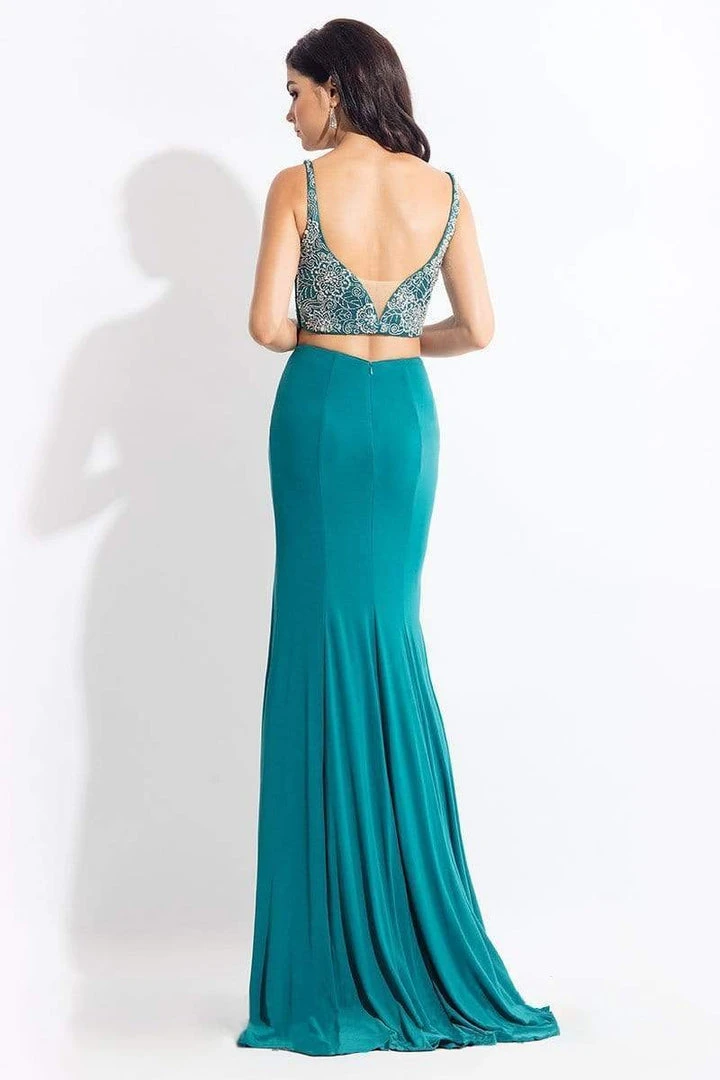 | Details: | Jersey, Two-Piece, Sleeveless, Crystal Ornate, V-Cut Open Back, Back Zipper Closure, Illusion Inset, Thigh High Slit, Sweep Train |