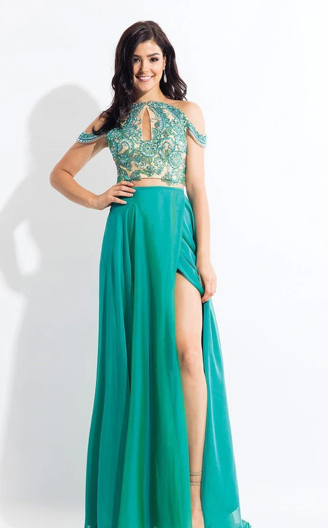 Feel gorgeous when you walk into the party wearing this Rachel Allan 6109 evening gown. This two piece ensemble features floral-appliqued crop top with cold-shoulder straps edging the thin halter neckline. A front keyhole complements the cutout back. The midriff is exposed. The flowy chiffon skirt with an apparent A-line silhouette is set on a thin waistband and finishes in a sweep train. A center zipper closure secures this dress. Make a fashion forward statement in this lovely Rachel Allan design.