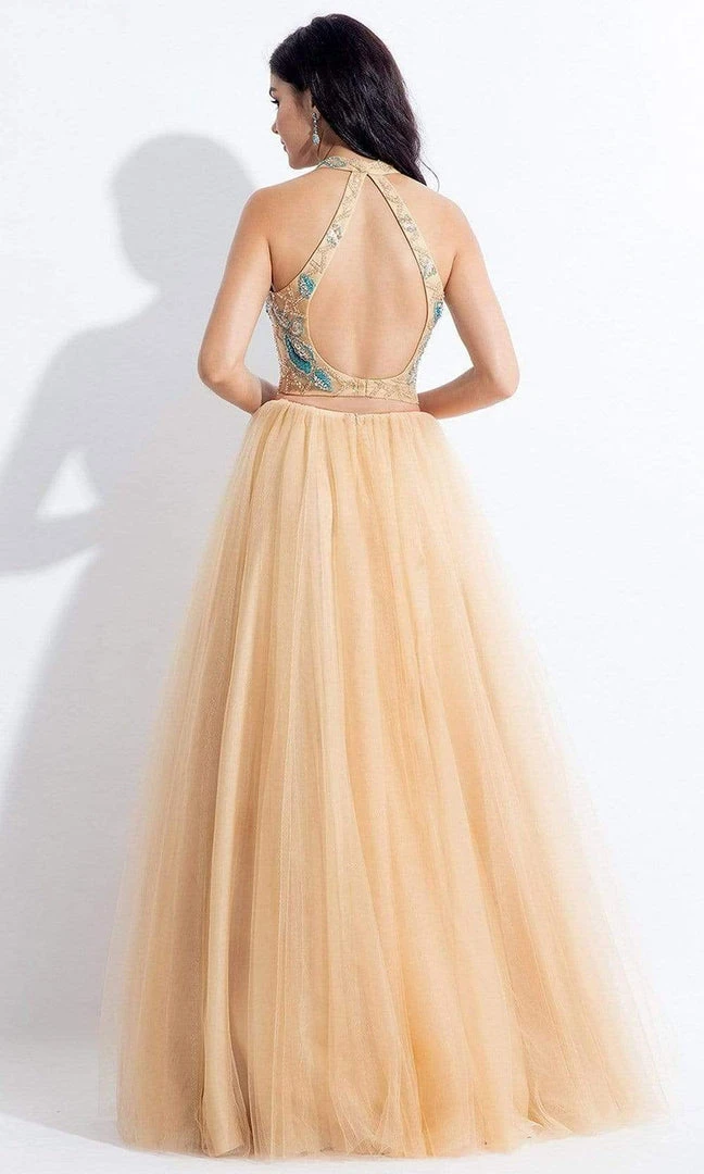 You’ll be positively radiant in this fabulous Rachel Allan 6155 masterpiece. This two-piece gown features a floral-beaded crop top with a cross-halter neckline and front keyhole. The midriff is exposed. The skirt is crafted in tulle fabric and cascades gorgeously to the floor. The back highlights a big cutout detail and center zipper closure. Show off your enchanting beauty in this glamorous Rachel Allan style.